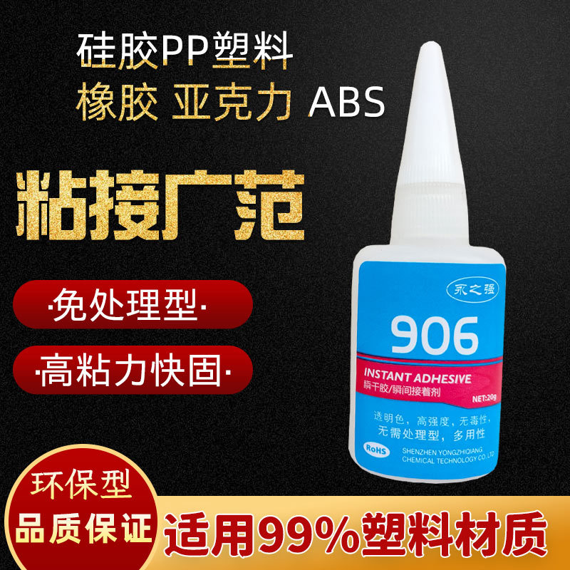 906(快干 )--粘接难粘的材料:免处理/处理。(硅胶/TPR/PP/TPU/PE尼龙/PU/POM赛钢 ) 可以不用先涂处理剂,直接点胶水。解决普通胶水需要用处理剂的工序及节约出成本。粘接牢固。快干型,透明色。是一款解决难粘材料的胶水。