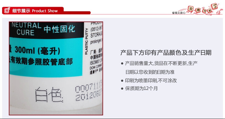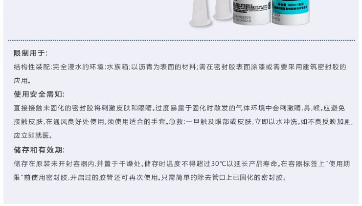 使用安全须知:直接接触未固化的密封胶将刺激皮肤和眼睛。过度暴露于固化时散发的气体环境中会刺激眼睛、鼻、喉。应避免接触皮肤。在通风良好处使用。须使用合适的手套。