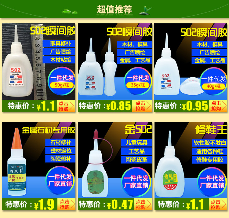 502 접착제는 철, PVC, 금속, 석재 등에 붙일 수 있으며, 충격에 강하고, 금속, 플라스틱, 고무 등에 적합하며, 고점도를 자랑합니다.