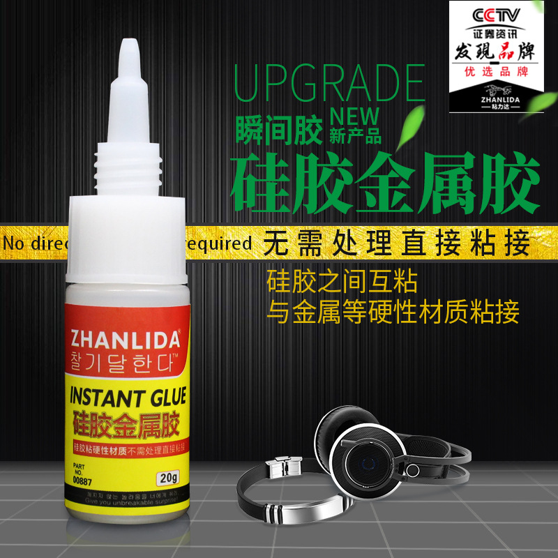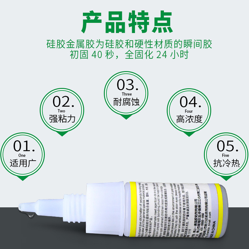 单组份硅胶专用强力快干胶粘剂,其特点是固化快、粘接强度大、胶接物表面不需严格处理,无须使用促进剂,处理剂配合使用。对金属和塑胶、硅橡胶等材料具有良好的粘接性,粘接强度可达大于硅胶产品的本身强度