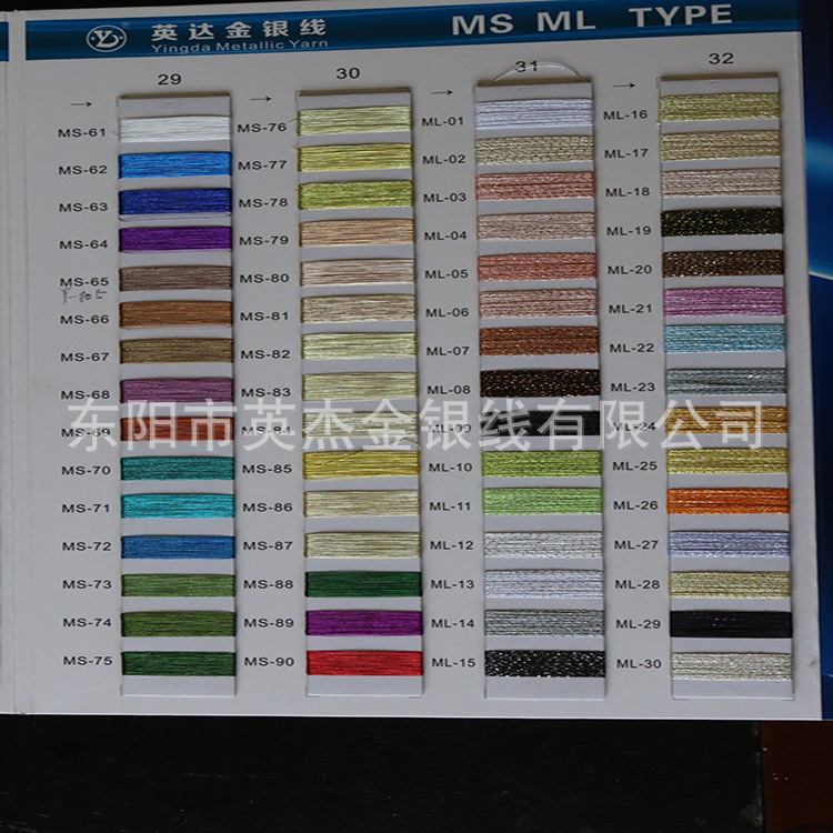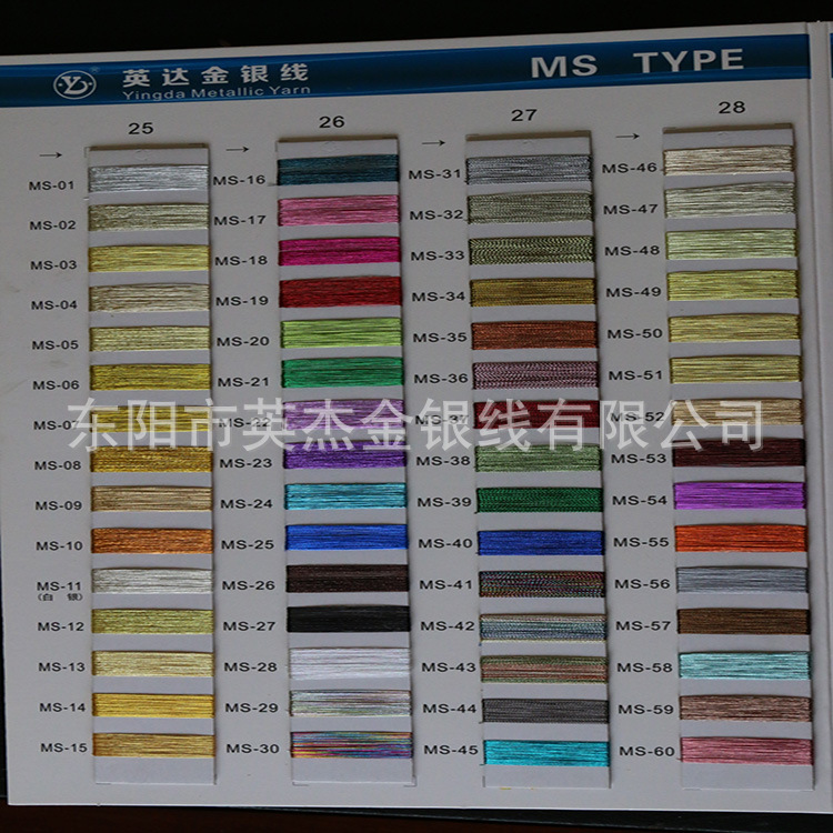 MS型金银线优点:该产品质地细腻、色彩华丽、色泽均匀、颜色齐全、质量稳定、质优价廉,超柔软、耐酸碱、耐高温、色牢度高,是平织、针织布类、羊毛衫类合织的理想衬饰原料,所加工编织成之布片、饰品,呈现出典雅大方、高贵华丽之质感,深受针织、毛织、鞋类、工艺界行业的欢迎。