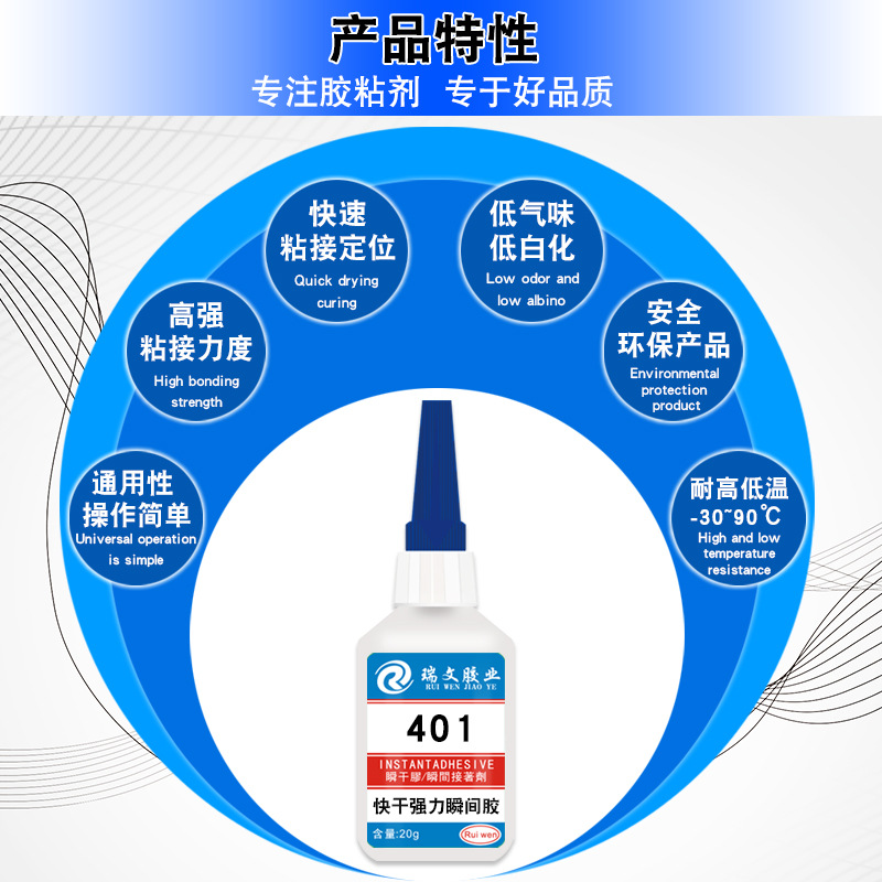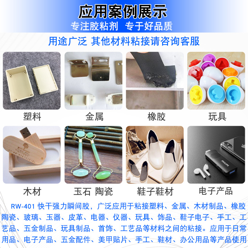 RW-401 快干强力瞬间胶,广泛应用于粘接塑料、金属、木材制品 橡胶、陶瓷、玻璃、玉器、皮革、电器、仪器、玩具、饰品、鞋子电 子、手工、工艺品、五金制品、玩具制品、首饰、工艺品等材料之间 的粘接。应用于日常用品、电子产品、五金配件、美甲贴片、手工、 鞋材、办公用品、工艺生产、医疗用品等产品使用;