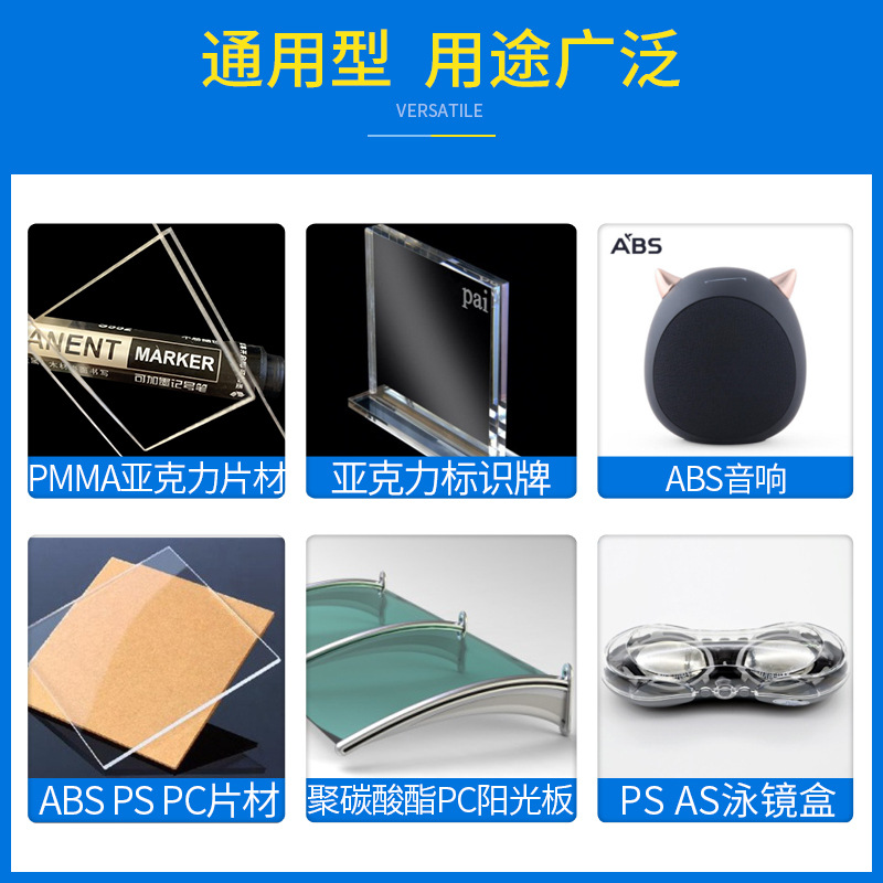 ABS 접착제는 유리 플라스틱 아크릴 PMMA 디스플레이 캐비닛, 보석 상자, PC에 사용 가능하며, 속건성 용제형 투명 제품입니다.