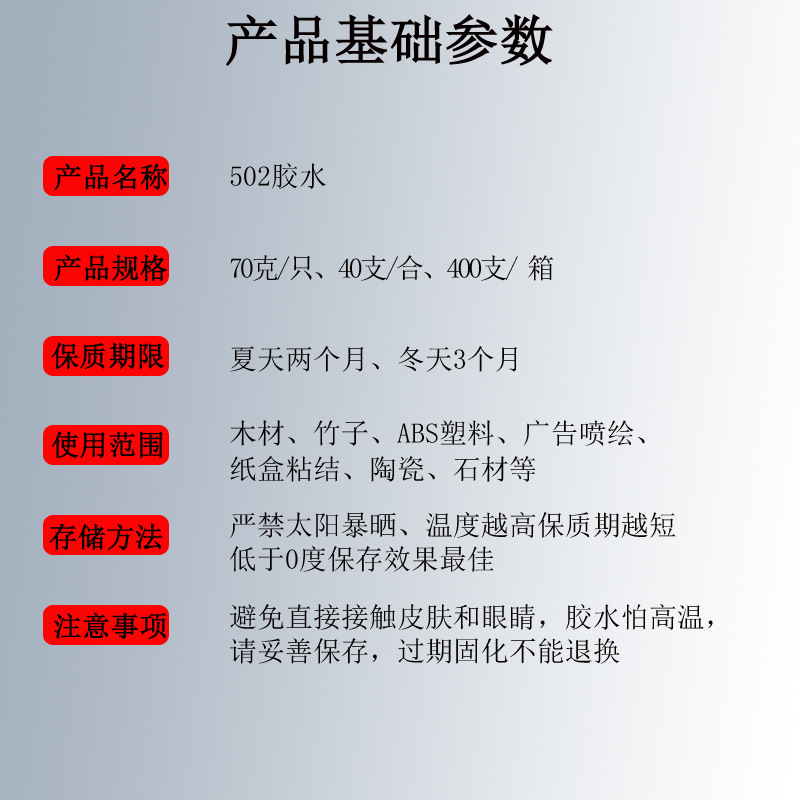 包装与贮存:70克胶水40支\盒 400支/箱,30克胶水50支\盒 500支\箱,保质期;夏季1-2个月 冬季3个月,过期不退换,胶水属于易挥发的产品,会有几克误差,请按量购买!
