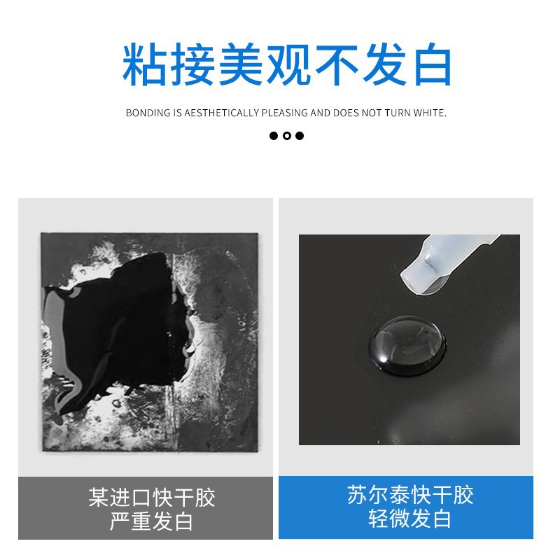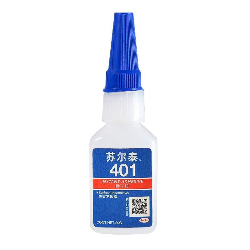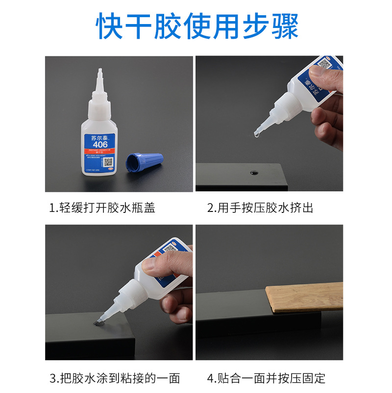 苏尔泰-401快干胶水,适用于硅胶粘塑料,硅胶粘 PC ,硅胶粘亚克力,硅胶粘 ABS ,硅胶粘尼龙,硅胶粘五金,硅胶粘电镀件,硅胶粘铝合金,粘接力强,无白化,耐水煮,不发黄,对油墨无腐蚀,粘度适中,环保气味小,适合手工与点胶机操作,粘接速度快,1分钟即可粘牢,15分钟可达到使用强度,广泛应用于手机厂,电子电器厂,硅胶厂,玩具饰品厂。(本产品同样适用于橡胶粘塑料)。全国免费提供样品测试,先试样,后购买。