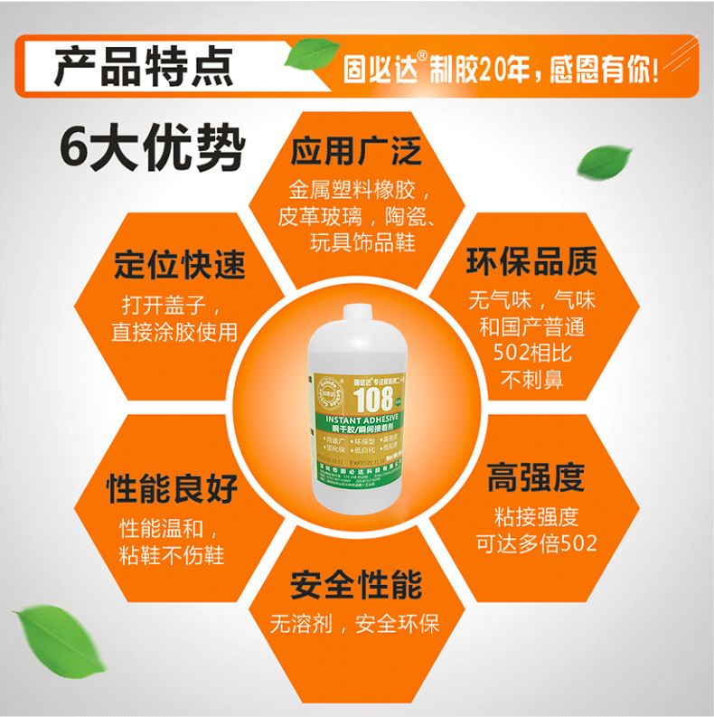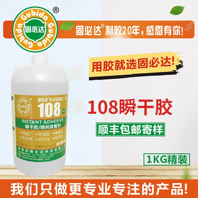 108瞬干胶是透明油状浓液体,针对金属、树脂、硅胶、橡胶、皮革、纺织物、塑料PVC,ABS,TPU,PU,EVA木材、海棉等有良好的粘接力,具有定位速度快、粘接力强、低发白。中等粘度透明,粘合后透明,有低白现象,胶体中软。胶合初固时间1-3秒左右,方便操作。完全固化后合为一体可以达到破坏的强度。符合环保标准。