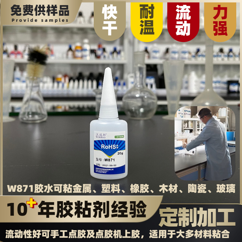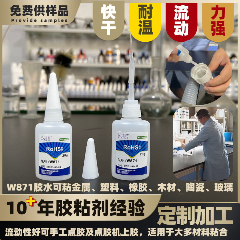 2、 将需粘接材质表面用W871胶水涂刷后紧贴,室温3~5秒定位,2~5分钟表面固化(若涂胶较多或粘合面较大固化时间会延长)。