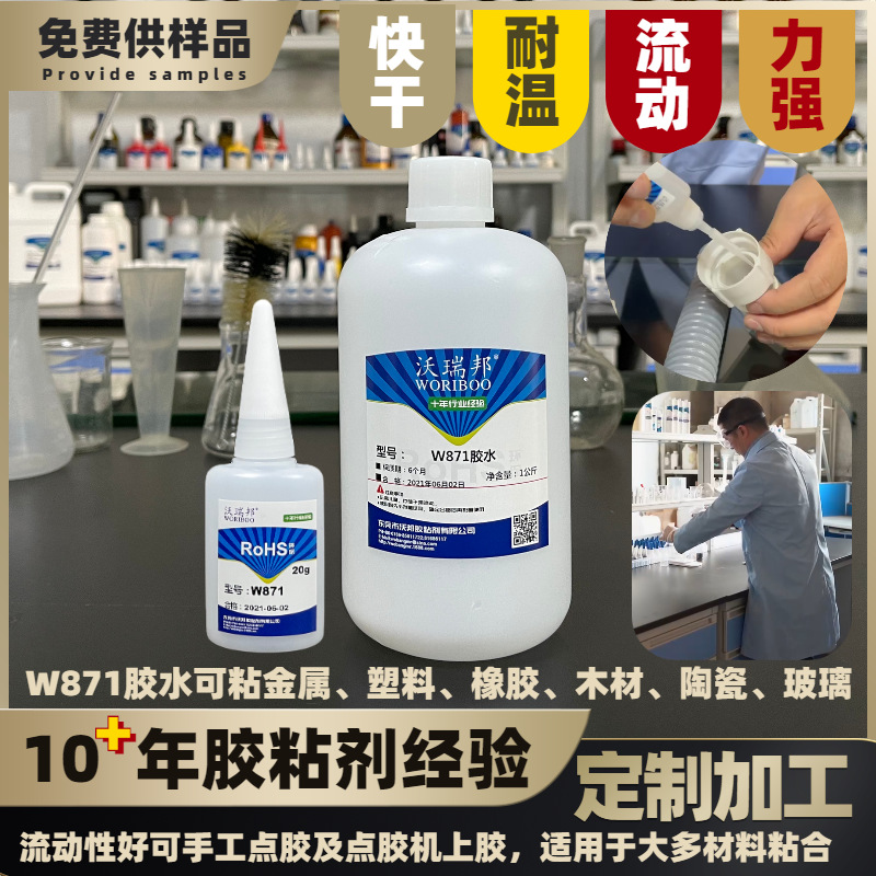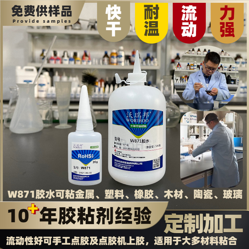 1、 可粘接金属、塑料、电镀元件、橡胶、陶瓷、木料、石头、玻璃、尼龙、皮革等等,可3-5秒定位,无白雾,耐加温加热,防水、耐80~100度水煮,胶质有韧性,具有很好的抗震动性能。