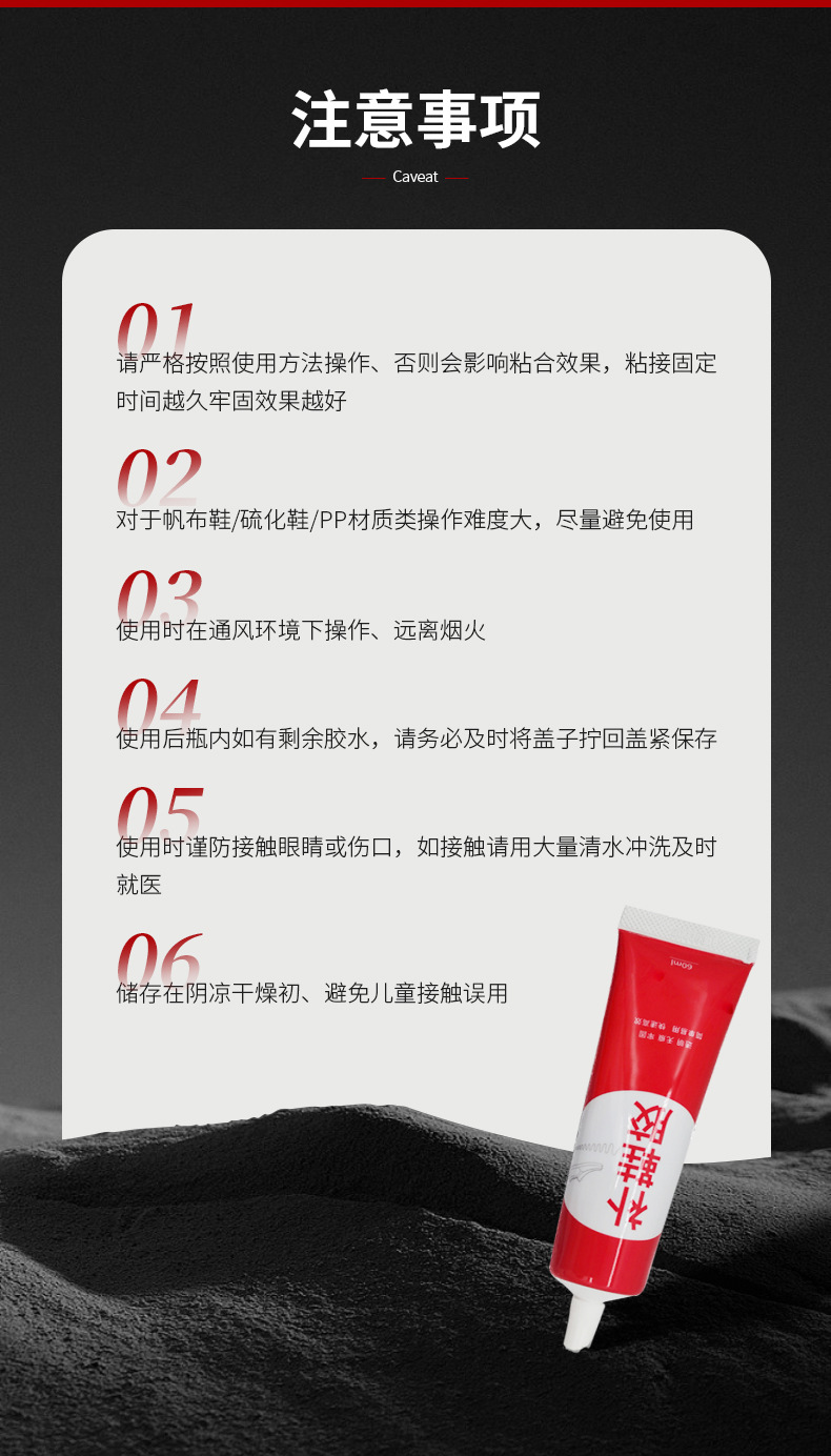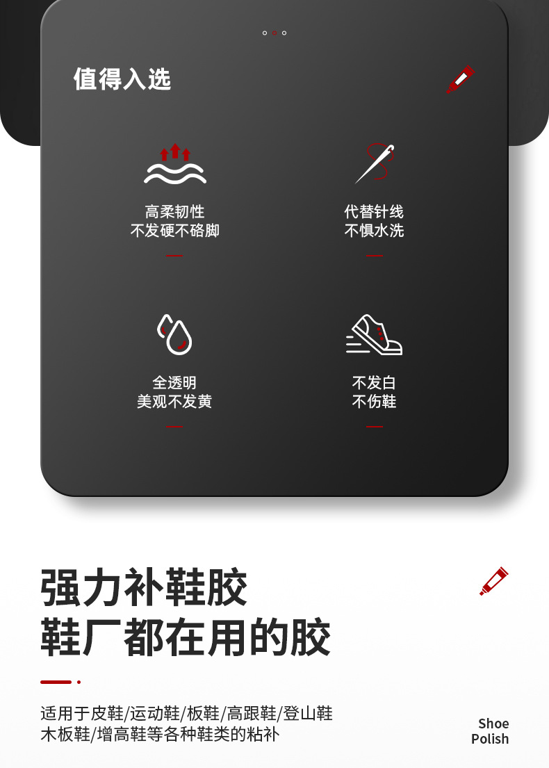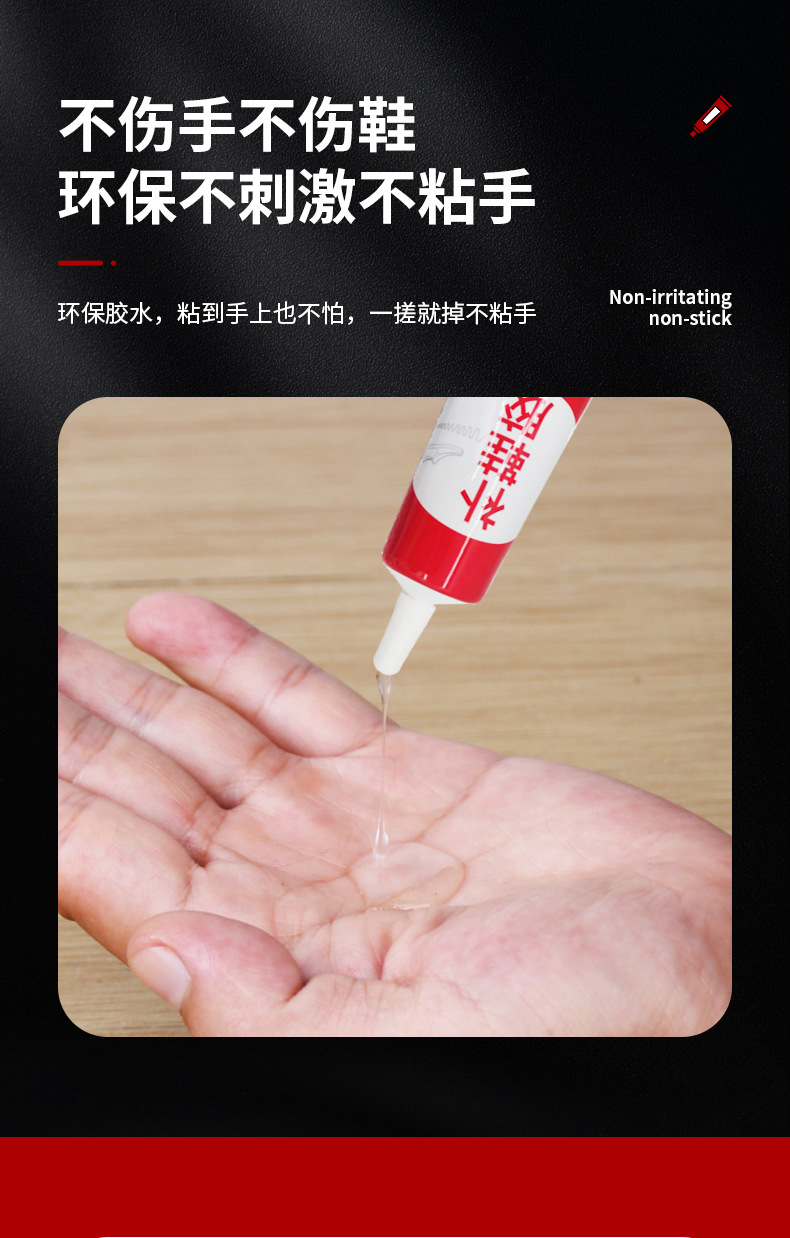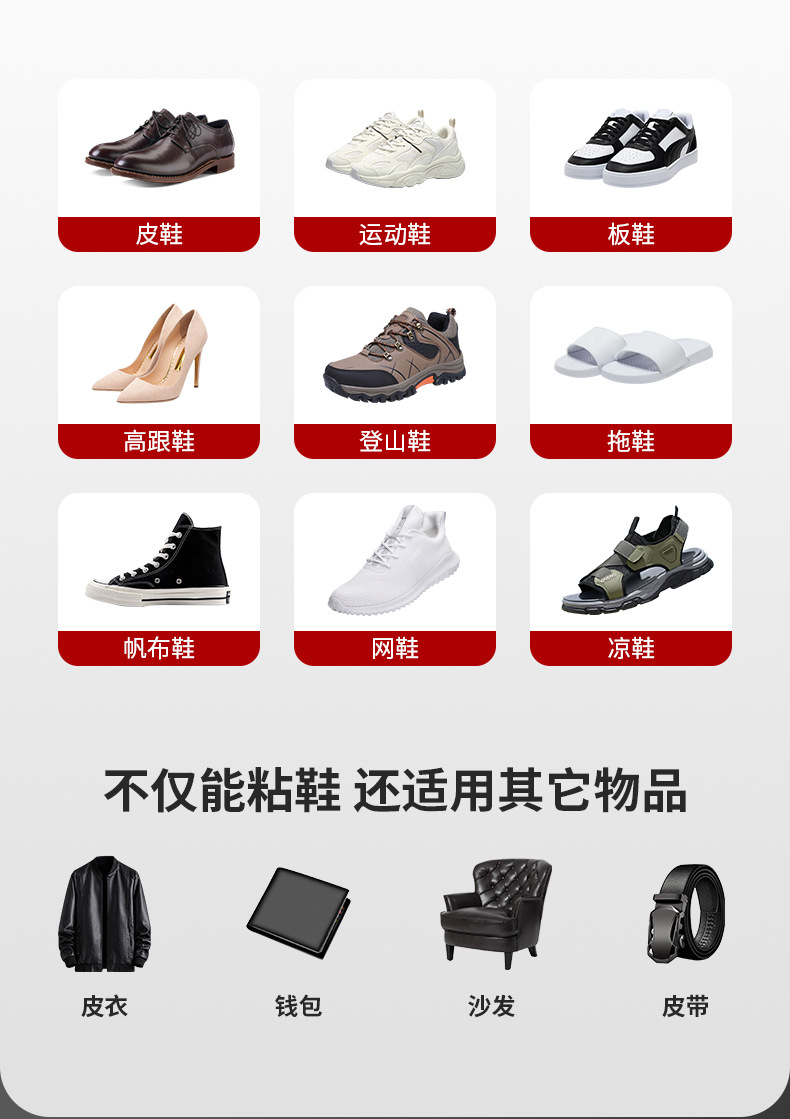 투명도가 높고 점도가 높은 고분자 수지 접착제입니다. 내수성이 좋고, 담가도 접착제가 열리지 않습니다. 신발이나 발에 상처를 주지 않으며 깨끗하고 조작이 간편하며 모든 종류의 신발 수리에 적합합니다.