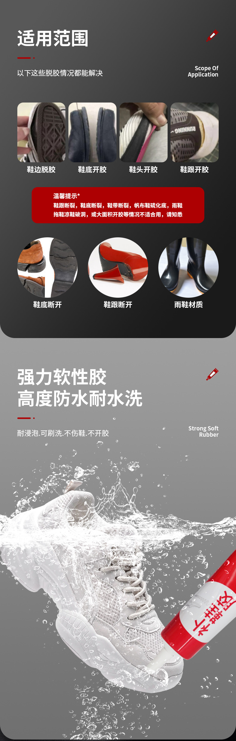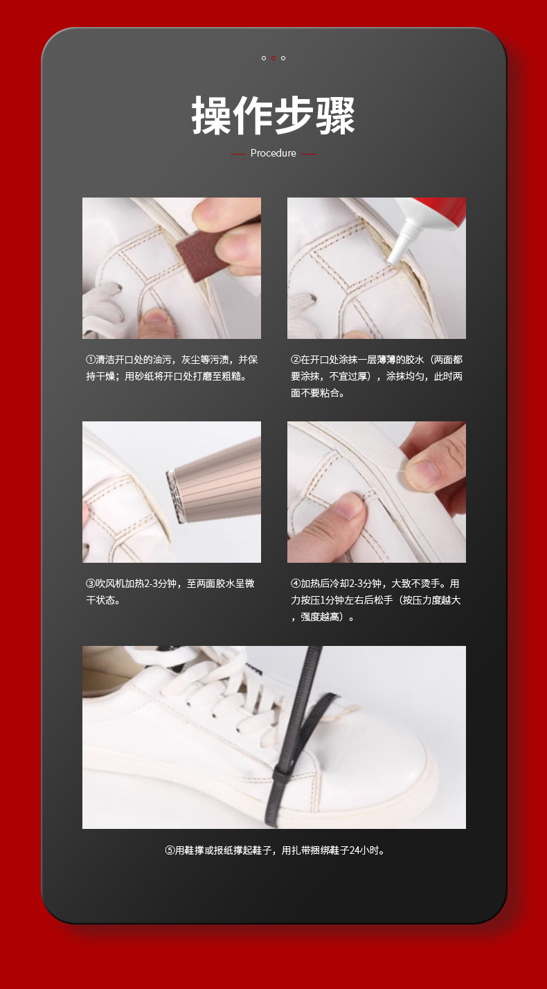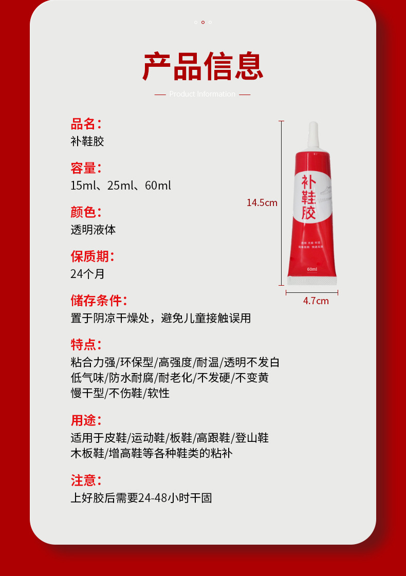 투명도가 높고 점도가 높은 고분자 수지 접착제입니다. 내수성이 좋고, 담가도 접착제가 열리지 않습니다. 신발이나 발에 상처를 주지 않으며 깨끗하고 조작이 간편하며 모든 종류의 신발 수리에 적합합니다.