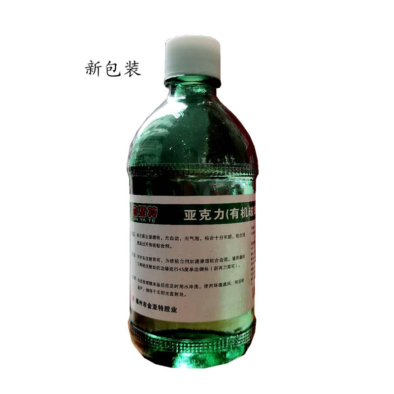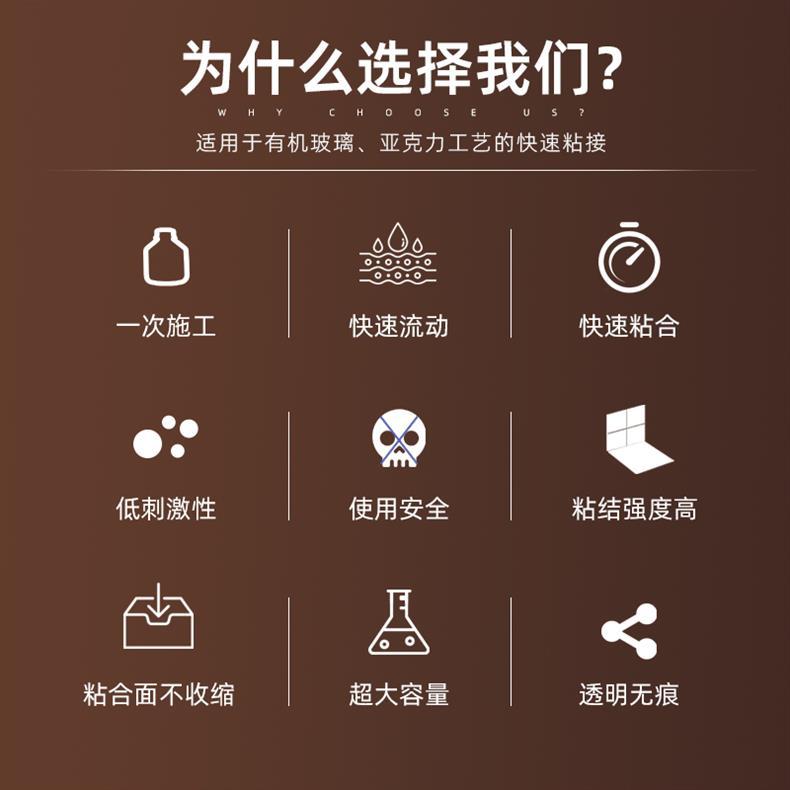 【产品特点】本粘合剂气味小,固化速度快,粘合后的有机玻璃均可看到透明,无痕迹,无气泡,无白痕的效果。