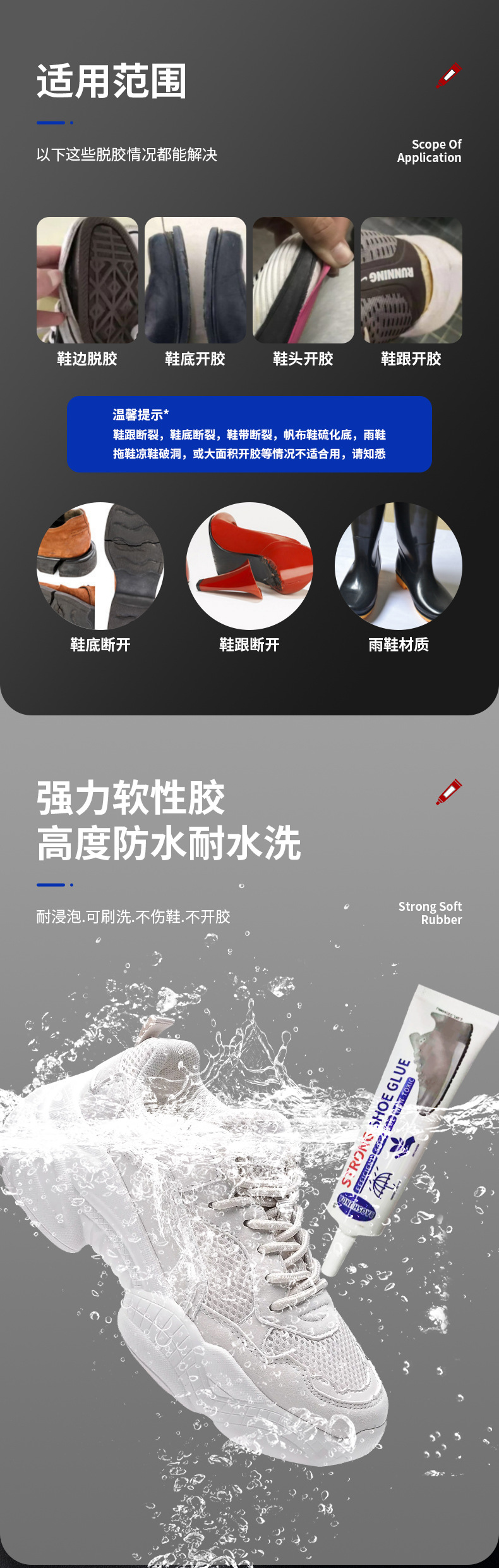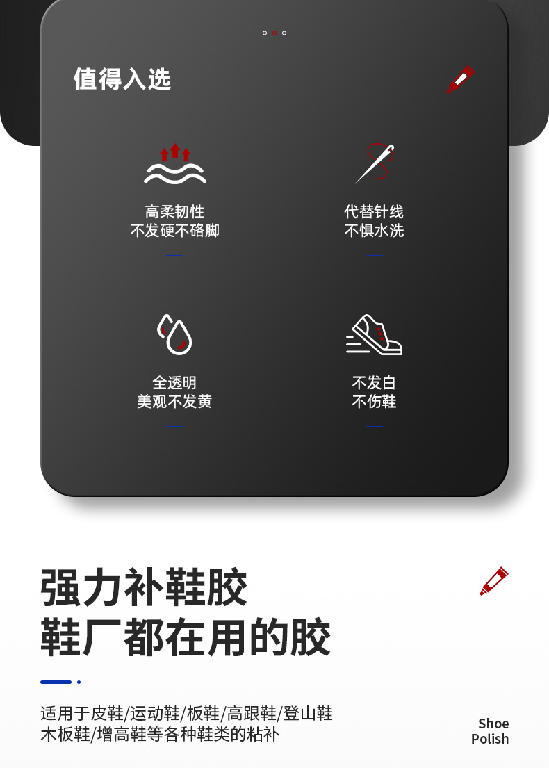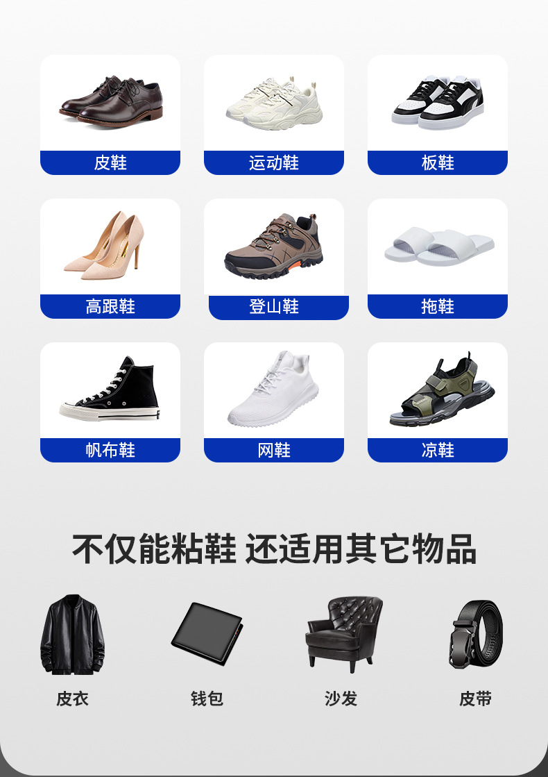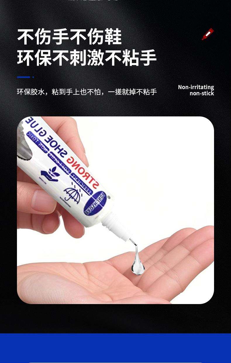 고분자 수지 접착제, 높은 투명성, 고점도.내수성이 좋고, 담가도 접착제가 열리지 않습니다.신발이나 발에 상처를 주지 않으며, 깨끗하고 조작이 간편하며, 모든 종류의 신발 수리에 적합합니다.