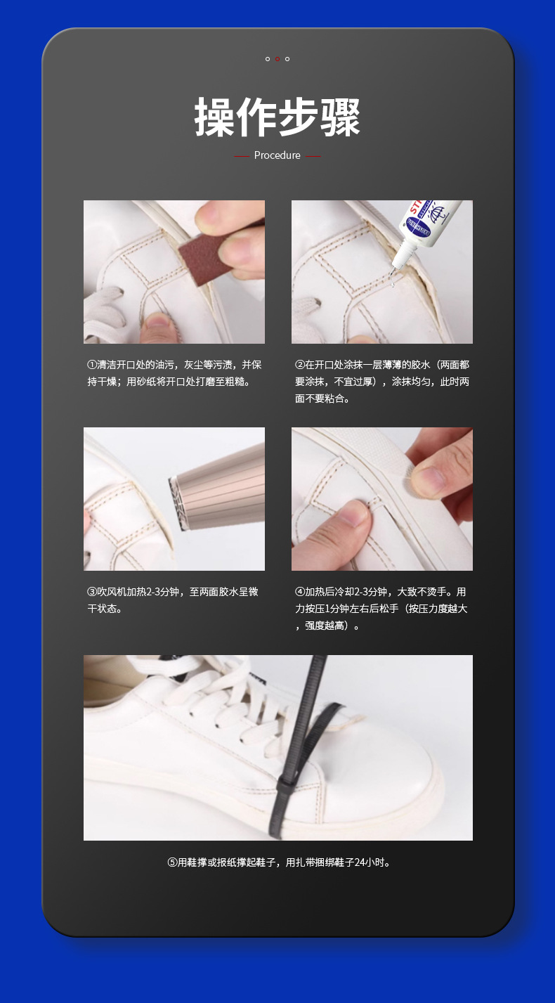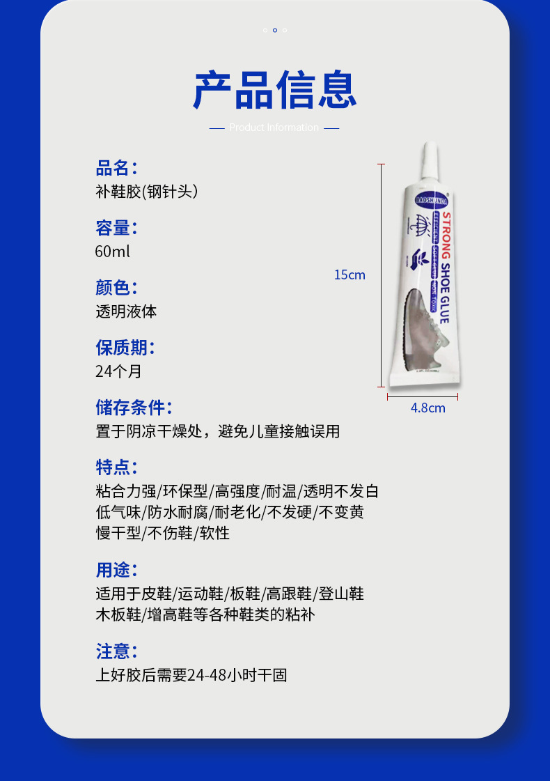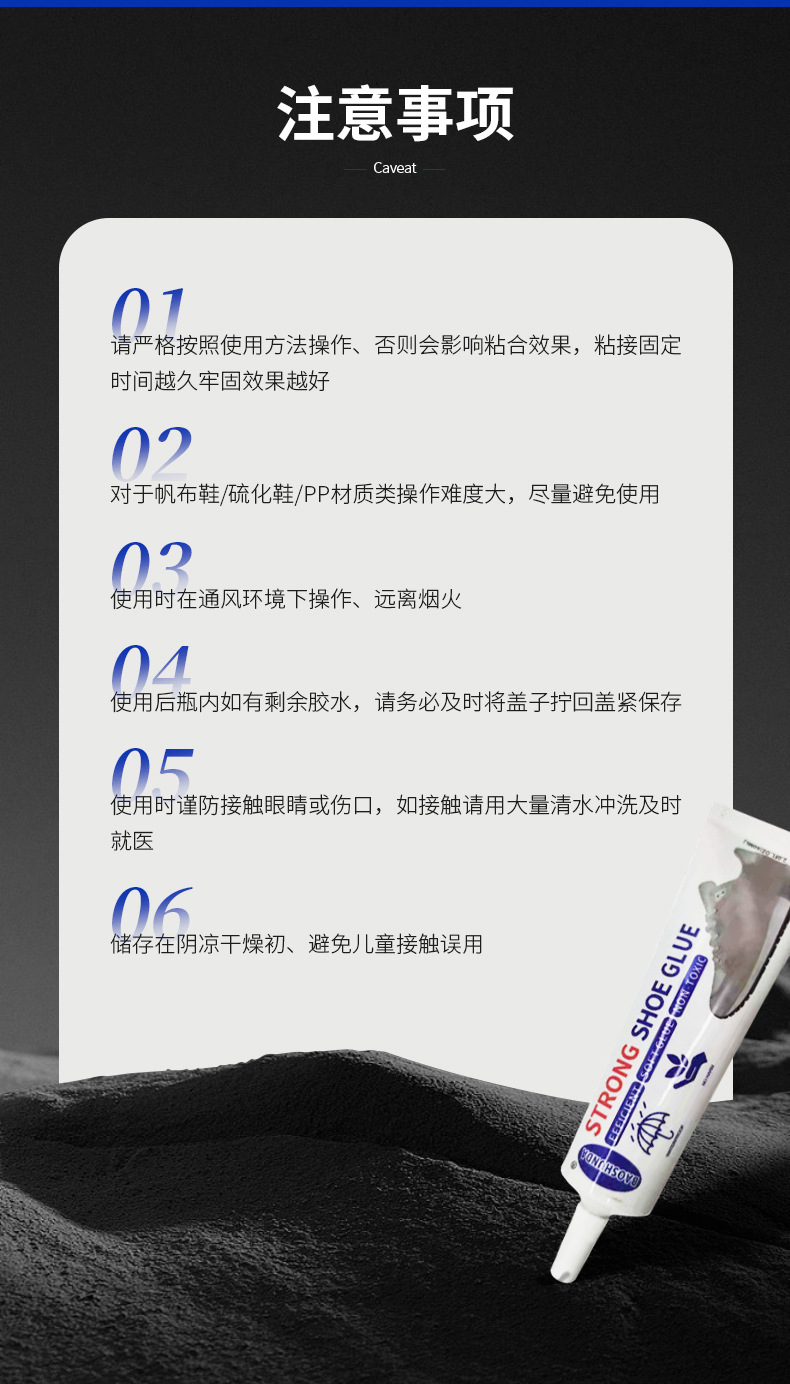 고분자 수지 접착제, 높은 투명성, 고점도.내수성이 좋고, 담가도 접착제가 열리지 않습니다.신발이나 발에 상처를 주지 않으며, 깨끗하고 조작이 간편하며, 모든 종류의 신발 수리에 적합합니다.