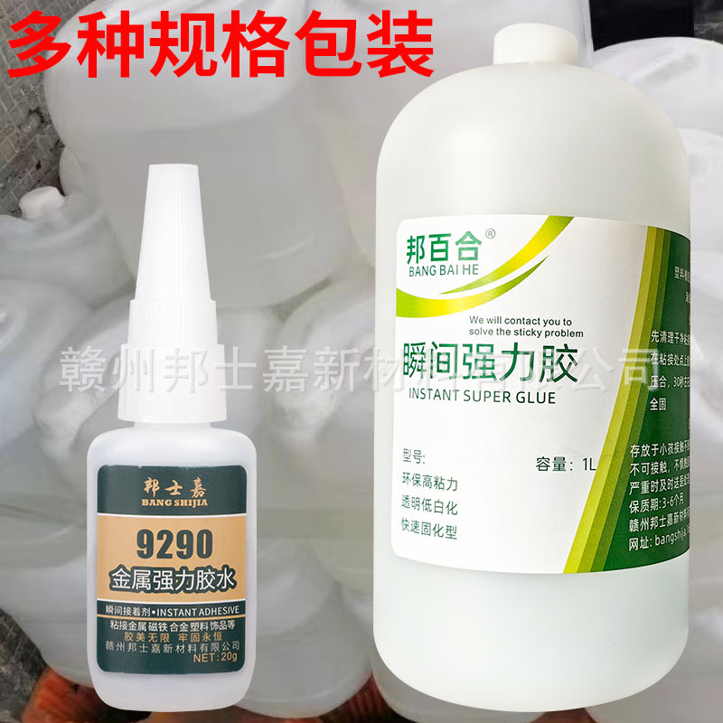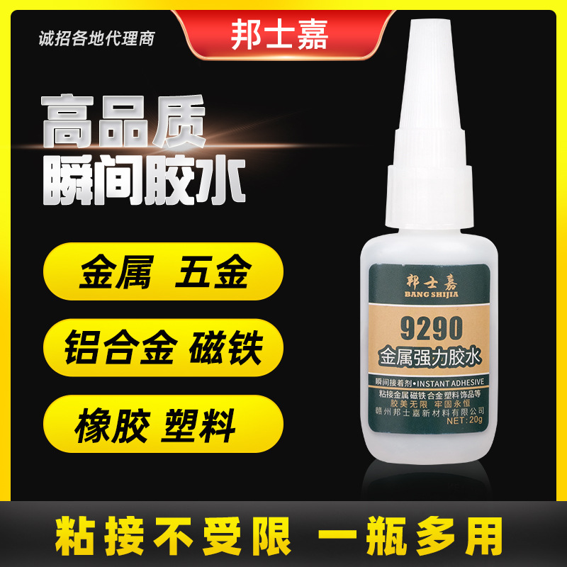 9290胶水是款快干型强力胶,用于金属,金属与塑料类材质粘接效果好,(如 金属 铁 铜 磁铁 铝合金 磁铁 ABS PC PVC PP ....陶瓷 皮革 海绵。。。)牢固度强,定位快,低白,透明液体,粘接材质广范。
