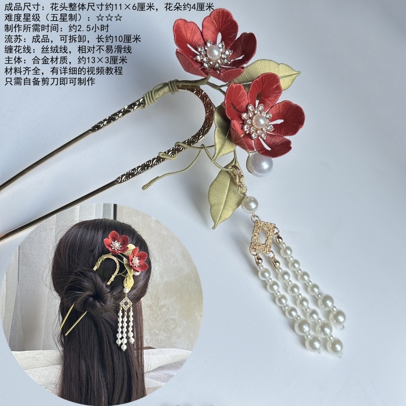 동백 시리즈 나무 머리핀 재료 패키지 1세트(술이 달린 진홍색 버전)